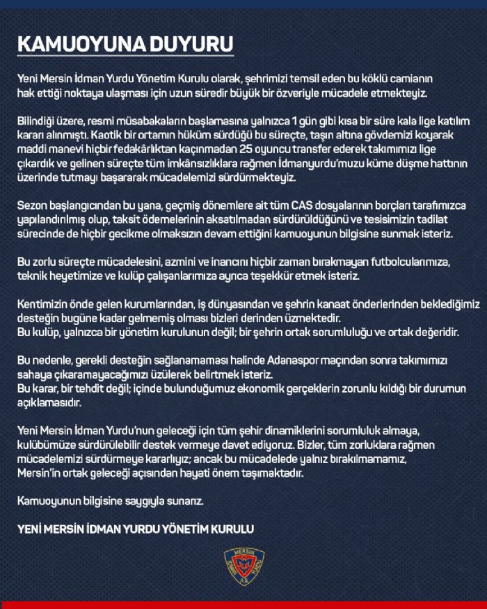 Yeni Mersin İdman Yurdu’nun geleceği için tüm şehir dinamiklerini sorumluluk almaya, kulübümüze sürdürülebilir destek vermeye davet ediyoruz. Bizler, tüm zorluklara rağmen mücadelemizi sürdürmeye kararlıyız; ancak bu mücadelede yalnız bırakılmamamız, Mersin’in ortak geleceği açısından hayati önem taşımaktadır"