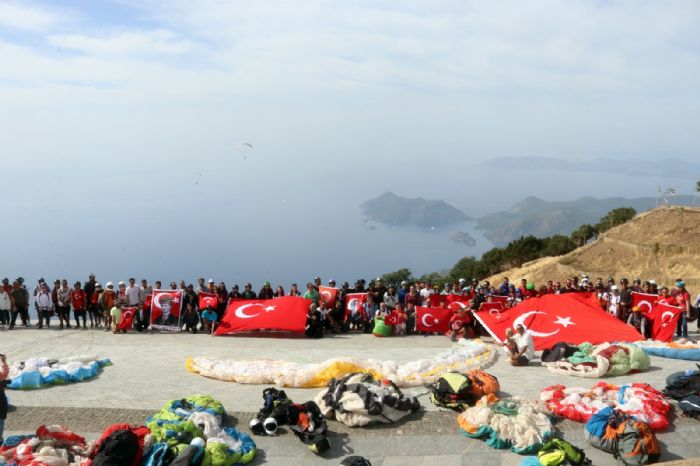 Muğla Fethiye’de Cumhuriyet’in 100. yıl dönümü etkinlikleri çerçevesinde, pilotlar 100 üniversite öğrencisiyle Ölüdeniz’de yamaç paraşütü uçuşu gerçekleştirdi.