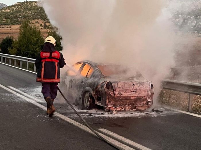 Mersin’in Tarsus-Çamlıyayla karayolunda hareket halindeki otomobil alev alev yandı.